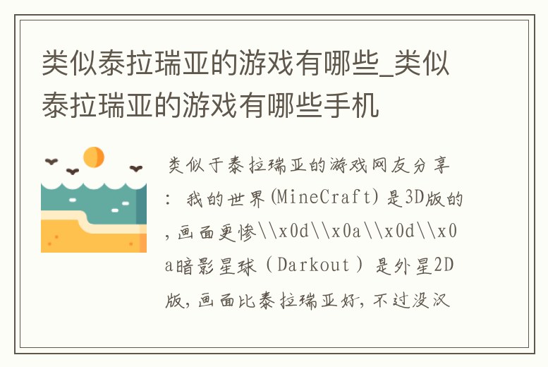 網友分享:我的世界(MineCraft)是3D版的,畫面更慘\x0d\x0a\x0d\x0a暗影星球(Darkout)是外星2D版,畫面比泰拉瑞亞好,不過沒漢化,運行有點卡.\x0d\x0a星際探索者(PlanetExplorers)是外星3D版,畫面也很好,不過還不是。
