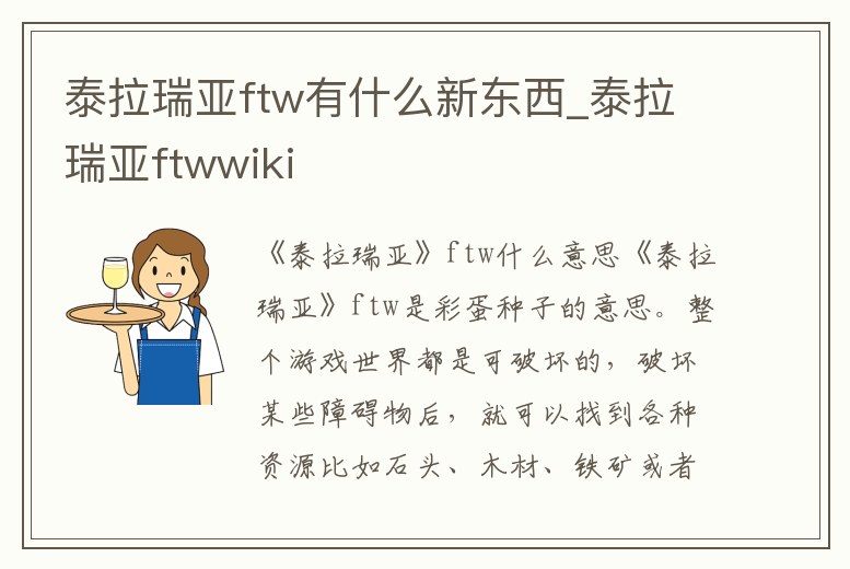 《泰拉瑞亞》ftw什么意思《泰拉瑞亞》ftw是彩蛋種子的意思。整個游戲世界都是可破壞的,破壞某些障礙物后,就可以找到各種資源比如石頭、木材、鐵礦或者其他裝備。當然,在不斷深入的同時,也會遇到各種怪物。游戲的主要任務就是讓玩家利用各種資源按自。1、《泰拉瑞亞》ftw什么意思fortheworthy是指彩蛋種子。《泰拉瑞亞》Switch中文版,于2019
