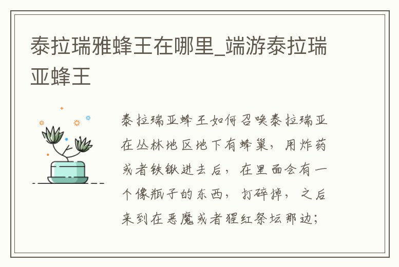 召喚蜂王的條件就是要前往地下叢林去摧毀幼蟲,這樣就可以召喚出蜂王boss了。當然還有另一種召喚方法,那就是前往叢林或者是地下叢林使用憎惡之蜂來直接進行召喚即可,這樣就可以召喚蜂王進行挑戰了。蜂王這個boss難度在前期比較大。