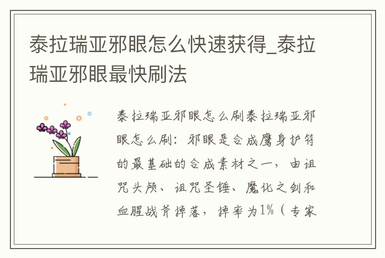 泰拉瑞亞邪眼怎么刷:邪眼是合成鷹身護符的最基礎的合成素材之一,由詛咒頭顱、詛咒圣錘、魔化之劍和血腥戰斧掉落,掉率為1%(專家模式下為2%)。除了詛咒頭顱外,其他三只怪物生成較少,所以推薦去地牢點上水蠟燭,刷詛咒。