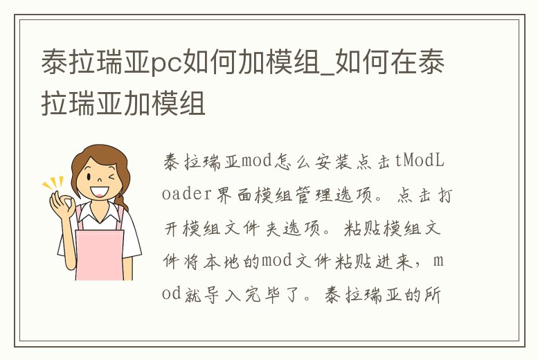 點擊tModLoader界面模組管理選項。點擊打開模組文件夾選項。粘貼模組文件將本地的mod文件粘貼進來,mod就導入完畢了。泰拉瑞亞的所有MOD是在這款“tModLoader”工具上面運行的,我們一般簡稱TMOD。TMOD是完全免費的。