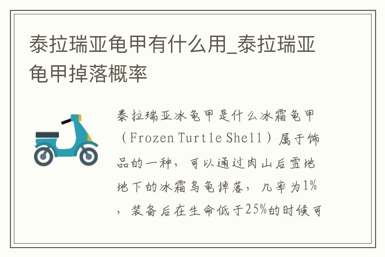 冰霜龜甲(Frozen Turtle Shell)屬于飾品的一種,可以通過肉山后雪地地下的冰霜烏龜掉落,幾率為1%,裝備后在生命低于25%的時候可以增加30點防御,而在pc1.3版本中,會在生命低于50%的時候減少25%受到的傷害。