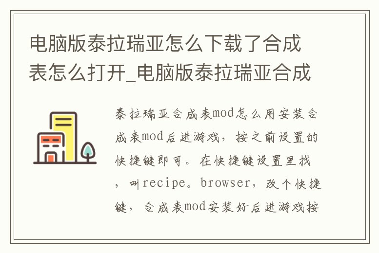 安裝合成表mod后進游戲,按之前設置的快捷鍵即可。在快捷鍵設置里找,叫recipe。browser,改個快捷鍵,合成表mod安裝好后進游戲按之前設置好的快捷鍵即可。合成表MOD擁有查看合成配方,物品圖鑒,NPC圖鑒等功能,支持搜索&環境等。