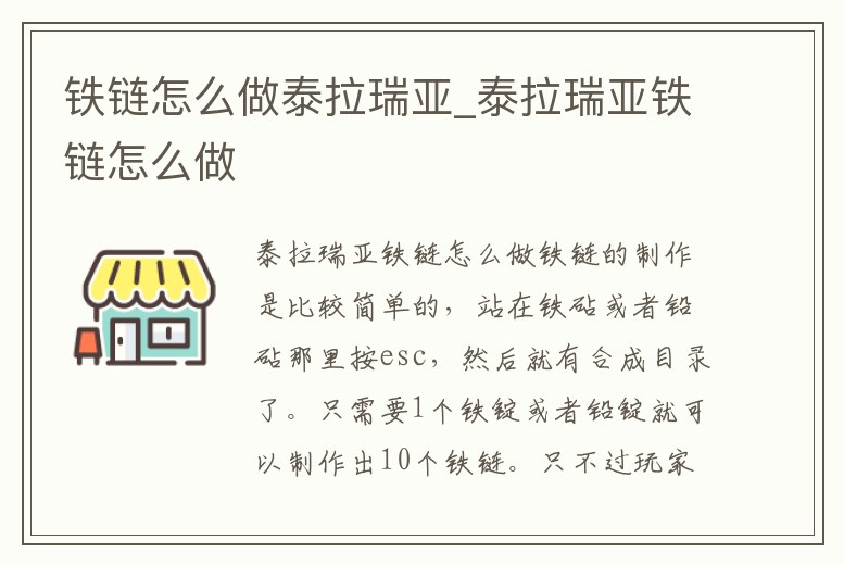 問題三:泰拉瑞亞鐵鏈怎么合成 鐵鏈的制作是比較簡單的,只需要一塊鐵錠在鐵氈出就可以制作處10個鐵鏈,非常的物超所值。只不過玩家需要開挖出鐵礦石在熔爐里面煅燒成鐵錠才能使用,不能直接使用原材料。問題四:泰拉瑞亞。