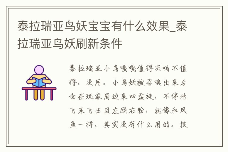 不值得。沒用。小鳥妖被召喚出來后會在玩家周邊來回盤旋,不停地飛來飛去且左顧右盼,就像和風魚一樣。其實沒有什么用的。技能不會提高。小鳥嘎嘎只有是一種物品,沒有什么用,不會帶來任何技能的提高。