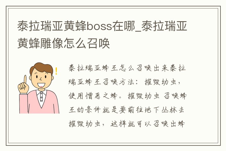 召喚蜂王的條件就是要前往地下叢林去摧毀幼蟲,這樣就可以召喚出蜂王boss了。當然還有另一種召喚方法,那就是前往叢林或者是地下叢林使用憎惡之蜂來直接進行召喚即可,這樣就可以召喚蜂王進行挑戰了。蜂王這個boss難度在前期比較大。