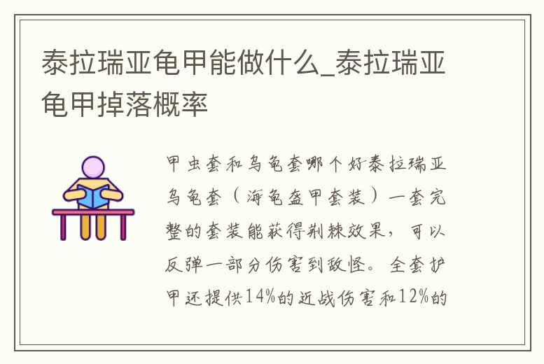 泰拉瑞亞烏龜套(海龜盔甲套裝)一套完整的套裝能獲得荊棘效果,可以反彈一部分傷害到敵怪。全套護甲還提供14%的近戰傷害和12%的近戰暴擊率,很不錯。甲蟲套的嘲諷效果感覺沒啥用,自已嗑點戰爭藥水點上水蠟燭就可以了。烏。