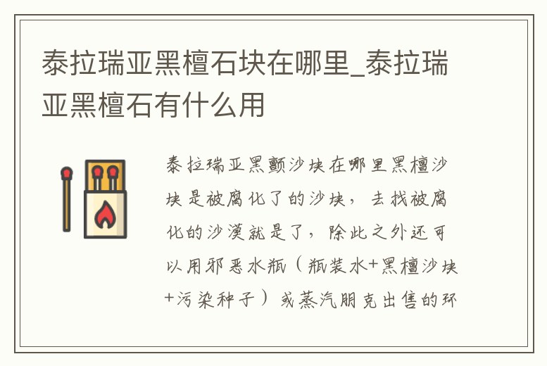 黑檀沙塊是被腐化了的沙塊,去找被腐化的沙漠就是了,除此之外還可以用邪惡水瓶(瓶裝水+黑檀沙塊+污染種子)或蒸汽朋克出售的環境改造器和紫色溶劑(腐化地圖日食的時候蒸汽朋克出售)對沙漠使用,普通的沙子就會變成腐化的。