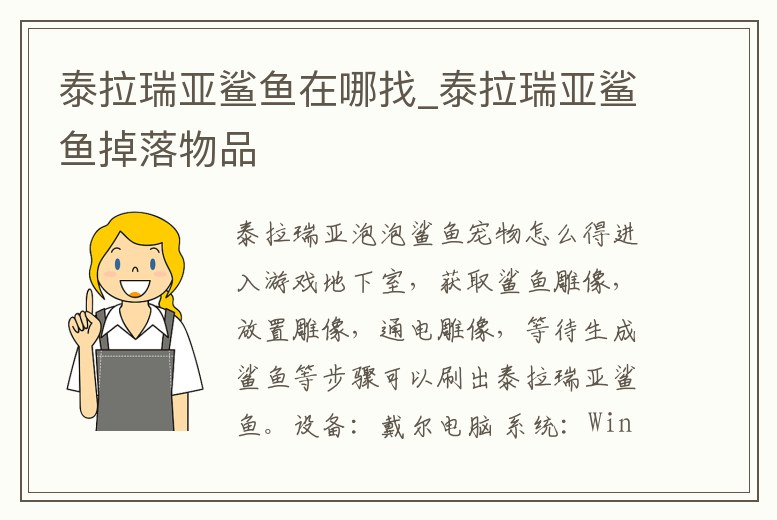 進入游戲地下室,獲取鯊魚雕像,放置雕像,通電雕像,等待生成鯊魚等步驟可以刷出泰拉瑞亞鯊魚。設備:戴爾電腦 系統:Windows10 軟件:泰拉瑞亞8.3.1 首先在打開的游戲中,可以看到,雕像大多在地下出現,一般在小黑屋或。