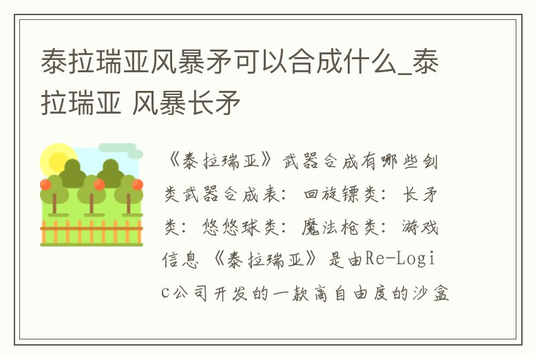 劍類武器合成表:回旋鏢類:長矛類:悠悠球類:魔法槍類:游戲信息 《泰拉瑞亞》是由Re-Logic公司開發的一款高自由度的沙盒游戲,于2011年5月16日在PC上發行。《泰拉瑞亞》Switch中文版,于2019年12。