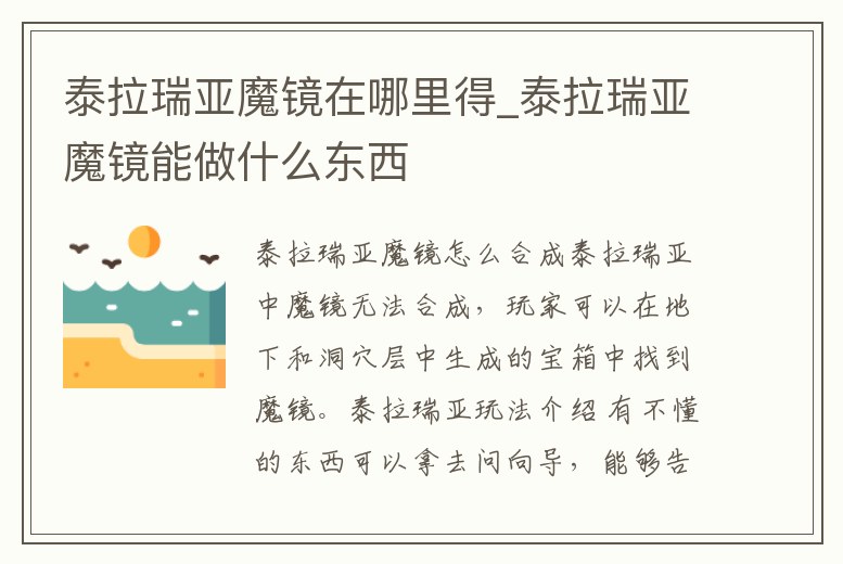 泰拉瑞亞中魔鏡無法合成,玩家可以在地下和洞穴層中生成的寶箱中找到魔鏡。泰拉瑞亞玩法介紹 有不懂的東西可以拿去問向導,能夠告訴你向上的合成及合成環境。血量需要地下的生命水晶升級,一個20點,最高裸體500(用生命水。