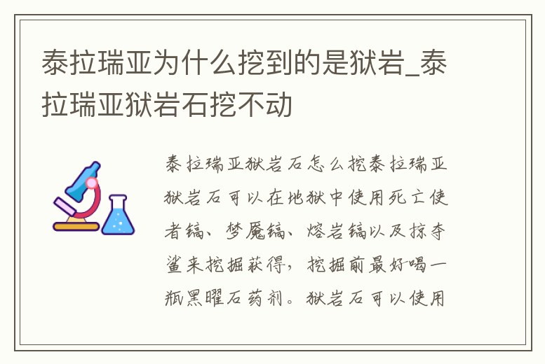 泰拉瑞亞獄巖石可以在地獄中使用死亡使者鎬、夢魘鎬、熔巖鎬以及掠奪鯊來挖掘獲得,挖掘前最好喝一瓶黑曜石藥劑。獄巖石可以使用好的鋤頭來挖,想死亡鎬、夢魘鎬這類都可以。然后因為挖了會變巖漿掉進去不見,所以要。