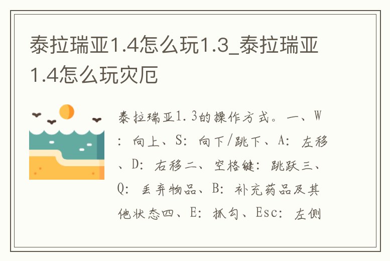 一、W:向上、S:向下/跳下、A:左移、D:右移 二、空格鍵:跳躍 三、Q:丟棄物品、B:補充藥品及其他狀態 四、E:抓勾、Esc:左側物品欄,右側裝備及隊伍列表/取消 五、數字鍵切換使用物品 在完成角色自定義后,游。