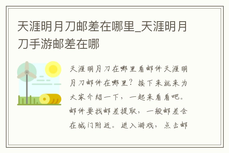 問題一:天涯明月刀郵差具 *** 置!急! 杭州城的郵差啊~在底下那個拍賣行的房子門口就是~哪個方向的門我不記得了 你圍著拍賣屋子外面轉一圈就能看到了!而且打開M 大地圖 也會標注出郵箱位置的(づ ̄3 ̄。