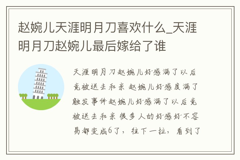 天涯明月刀趙婉兒好感滿了以后竟被送去和親 趙婉兒好感度滿了觸發事件