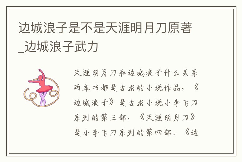 網友分享:沒記錯的話,邊城浪子是天涯明月刀的前傳 而且,我記得邊城浪子里,葉開和傅紅雪剛認識,天涯明月刀里,雖然葉開沒出現過,不過貌似兩人的關系很好啦 但是,在古龍的作品年表里,天涯明月刀是在前面的 所以可以說邊城浪子是。