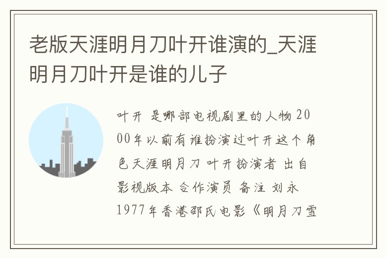 天涯明月刀 葉開扮演者 出自影視版本 合作演員 備注 劉永 1977年香港邵氏電影《明月刀雪夜殲仇》 狄龍、施思、陳萍、爾冬升 改編自《邊城浪子》 游天龍 1978年香港佳藝電視《金刀情俠》 鄭裕玲、余安安、魏秋樺 改編自《九。