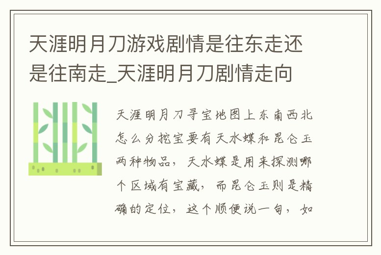 天涯明月刀尋寶地圖上東南西北怎么分挖寶要有天水蝶和昆侖玉兩種物品,天水蝶是用來探測哪個區域有寶藏,而昆侖玉則是精確的定位,這個順便說一句,如果根據提示分不清東南西北的可以打開大地圖,上北下南左西右東有木有,人物箭頭朝哪就是往哪走。正常流。1、天刀挖寶怎么確定方向問題五:天涯明月