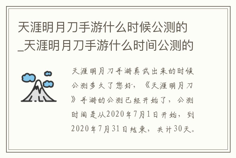 天涯明月刀手游真武出來的時候公測多久了您好,《天涯明月刀》手游的公測已經開始了,公測時間是從2020年7月1日開始,到2020年7月31日結束,共計30天。在這段時間里,玩家可以體驗到《天涯明月刀》手游的最新版本,并可以參與到游戲中的各種活動,獲得游戲內的各。2、天涯明月刀手游宣戰保護時間每周三八點至八點半半。《天涯明月刀》手游于于2016年07月01日在中國大陸正式公測更新,更新之后的
