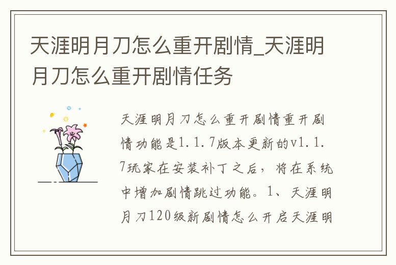天涯明月刀怎么重開劇情重開劇情功能是1.1.7版本更新的v1.1.7玩家在安裝補丁之后,將在系統中增加劇情跳過功能。1、天涯明月刀120級新劇情怎么開啟天涯明月刀120級新劇情開啟步驟有:進入天涯明月刀界面。點擊游戲章節。找到120級,點擊開啟即可。2、新手玩剛玩天涯明月刀,怎么看已經跳過的劇情網友分享:這個沒有辦法
