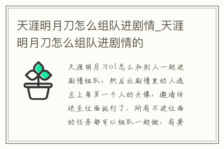 天涯明月刀ol怎么和別人一起進劇情組隊,然后讓劇情里的人選左上角另一個人的頭像,邀請傳送至位面就行了。所有不進位面的任務都可以組隊一起做,有要求進位面的必須離隊單獨完成,組隊刷任務怪確實要快很多。主線任務天刀的主線任務比較簡單,但是劇情又。1、天涯明月刀怎么聯(lián)機天涯明月刀聯(lián)機:在聊天頻道里別的玩家發(fā)過信息來,右擊玩家的名字,點擊“組隊”,對方同意后就可以加