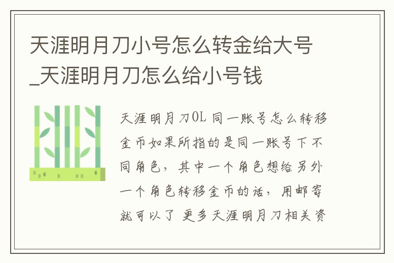 如果所指的是同一賬號下不同角色,其中一個角色想給另外一個角色轉移金幣的話,用郵寄就可以了 更多天涯明月刀相關資訊請關注電玩巴士天涯明月刀專區 。