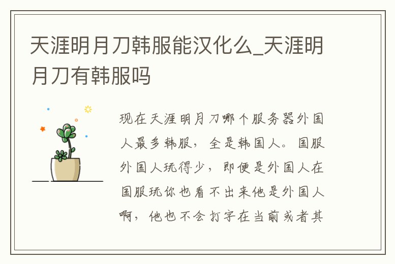 韓服,全是韓國(guó)人。國(guó)服外國(guó)人玩得少,即便是外國(guó)人在國(guó)服玩你也看不出來他是外國(guó)人啊,他也不會(huì)打字在當(dāng)前或者其他頻道里啊,他又看不懂中文,他打英文我們也看不懂啊。等不了多久天刀國(guó)際服會(huì)出來,到時(shí)候才好玩。