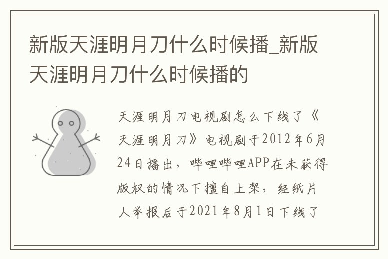 《天涯明月刀》電視劇于2012年6月24日播出,嗶哩嗶哩APP在未獲得版權的情況下擅自上架,經紙片人舉報后于2021年8月1日下線了,具體再次上架時間以官方通知為準。該劇是浙江華策影視股份有限公司出品的電視劇,改編自古龍武俠。
