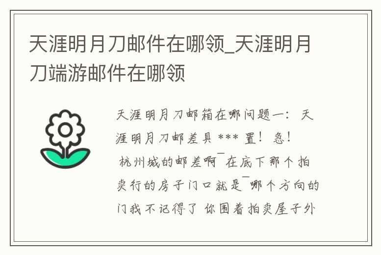 問(wèn)題一:天涯明月刀郵差具 *** 置!急! 杭州城的郵差啊~在底下那個(gè)拍賣(mài)行的房子門(mén)口就是~哪個(gè)方向的門(mén)我不記得了 你圍著拍賣(mài)屋子外面轉(zhuǎn)一圈就能看到了!而且打開(kāi)M 大地圖 也會(huì)標(biāo)注出郵箱位置的(づ ̄3 ̄。