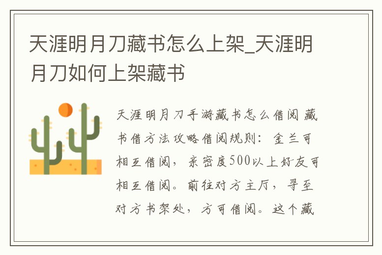 借閱規則:金蘭可相互借閱,親密度500以上好友可相互借閱。前往對方主廳,尋至對方書架處,方可借閱。這個藏書有很多的,需要大家在游戲中了解書籍的獲取地方,也是有很多的地方需要去獲取到的。以上就是我關于天涯明月刀手游藏。