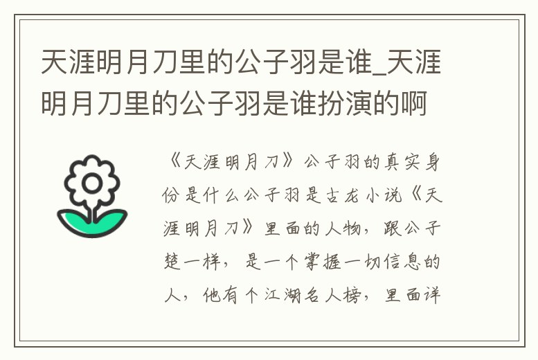 公子羽是古龍小說《天涯明月刀》里面的人物,跟公子楚一樣,是一個掌握一切信息的人,他有個江湖名人榜,里面詳細記錄了這個人的一切信息,出身門派性格有缺的等等,公子羽儼然就是整個江湖隱藏在暗處的最大老板,當然他也帶。