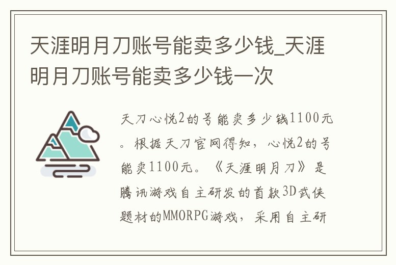 1100元。根據天刀官網得知,心悅2的號能賣1100元。《天涯明月刀》是騰訊游戲自主研發的首款3D武俠題材的MMORPG游戲,采用自主研發的Quicksliver引擎。