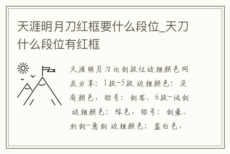 網友分享:1段-5段 邊框顏色:沒有顏色,稱號:劍客。6段-試劍 邊框顏色:綠色,稱號:劍豪。利劍-意劍 邊框顏色:藍白色,稱號:劍尊。心劍-造極 邊框顏色:紫色;稱號:劍圣。造極以上 邊框顏色:紅色,稱號。