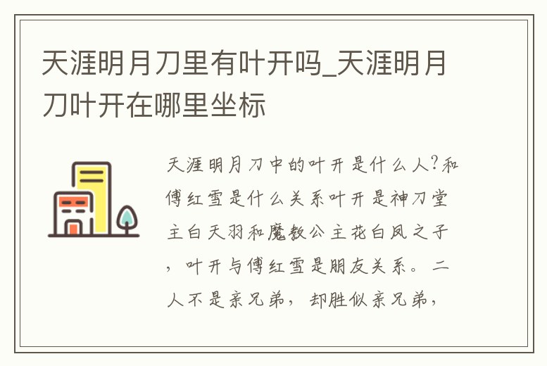 這個 在《天涯明月刀》的原作小說里好像是沒有葉開的,葉開是在古龍的小說《邊城浪子》里和傅紅雪一同出現的人物,那里講的是傅紅雪和葉開少年時期相識的一段故事,故事有點復雜。故事中神刀堂堂主白天羽在一個雪夜。