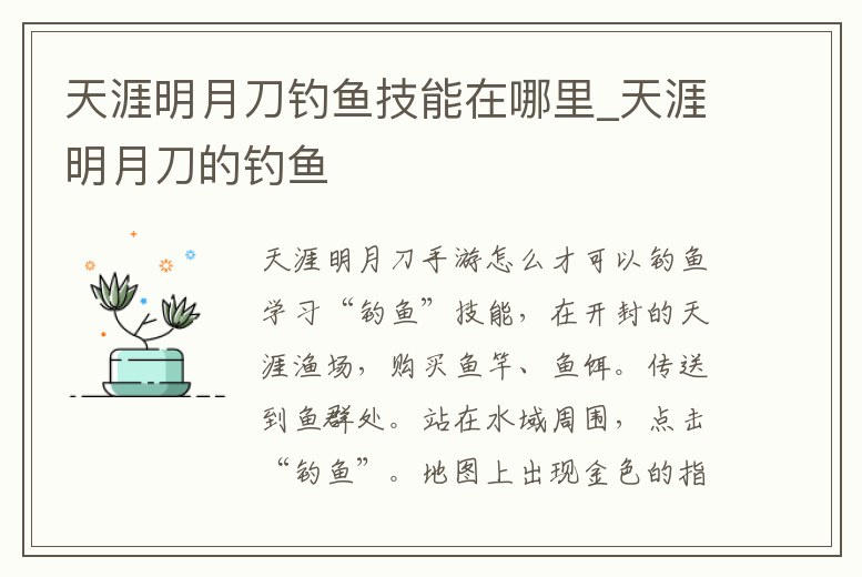 問題一:天涯明月刀有釣魚技能怎么學 首先,玩家在完成引導任務后,每天都可以通過任務去東極島找到NPC朱小月來了解釣魚功能,可以通過該NPC學習釣魚技能并獲得魚竿。開封和東極島的NPC朱小月都可以兌換釣魚的獎勵。天涯明月刀。
