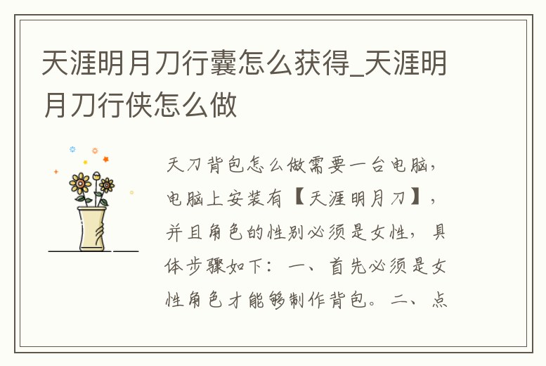 - 天涯明月刀行囊怎么獲得_天涯明月刀行俠怎么做