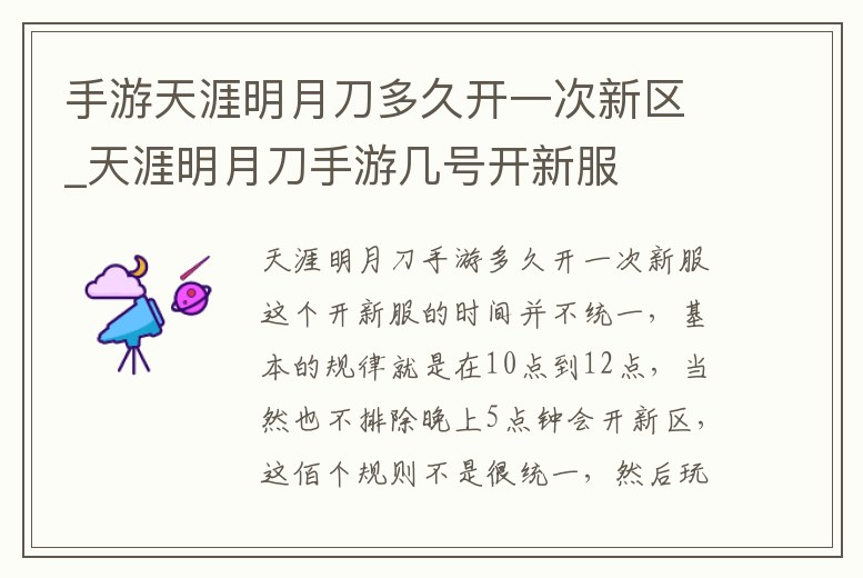 2021年天涯刀手游新區開服時間表 1.沒有官方宣布開業時間,都是突然離開新區。就近期開盤時間來看,新區一般半個月開盤一次,最近一次是12月31日開盤。預計1月中旬很快會有新區,至少一個月后肯定會有新衣。2.不建議玩家看。