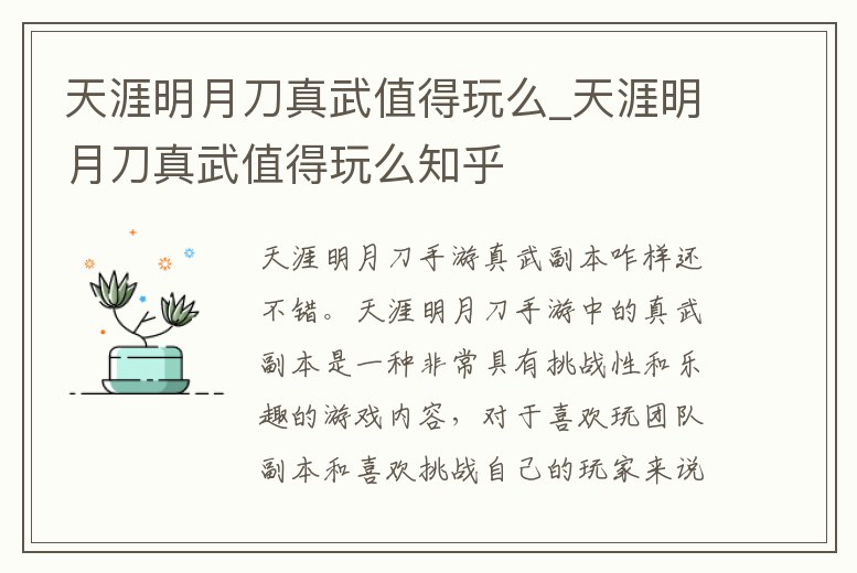 天涯明月刀真武值得玩么_天涯明月刀真武值得玩么知乎
