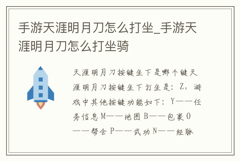 天涯明月刀按鍵坐下打坐是:Z,游戲中其他按鍵功能如下:Y——任務信息 M——地圖 B——包裹 O——幫會 P——武功 N——經脈 U——好友 I——成就 9、K——江湖身份 10、L——英雄。
