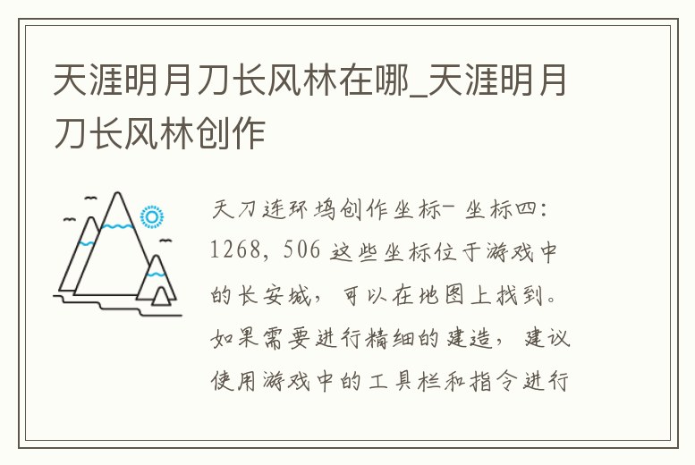 - 坐標四:1268, 506 這些坐標位于游戲中的長安城,可以在地圖上找到。如果需要進行精細的建造,建議使用游戲中的工具欄和指令進行操作。并注意,在建造的過程中需要考慮場景的整體布局、細節渲染以及與游戲世界的融合度等因素。