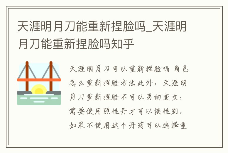 問題四:天涯明月刀ol捏臉可以重新捏么 目前沒有這個功能,你只能選擇湊合著用,或者重新建號捏臉。其實不要這么糾結,你在游戲中根本不會看玩家的臉的,最多看看他是什么職業而已,組隊的時候就只看看職業和男女,至于相。