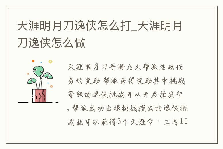 天涯明月刀逸俠怎么打_天涯明月刀逸俠怎么做