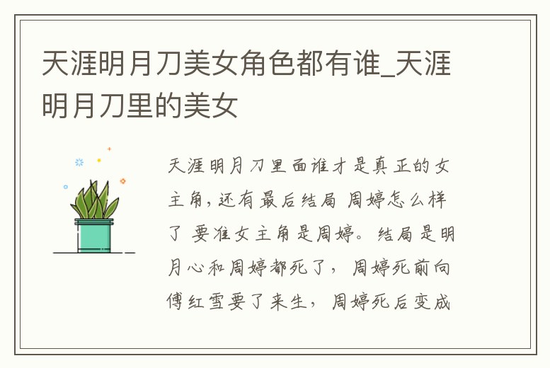 《天涯明月刀》原著女主角是周婷。周婷后來是云天之巔公子羽的紅衣使者,也是真正的翠濃,后來為了最后的大boss,用了一生只能用一次的紅花烈焰掌,頭發全白了,后來傅紅雪才知道自己真正喜歡的是周婷,最后就是大團圓結局啦。