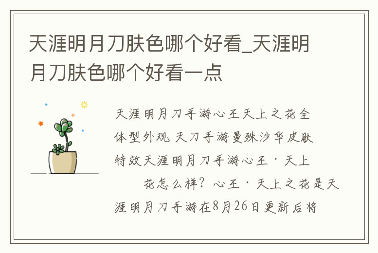 天涯明月刀手游心王·天上之花怎么樣?心王·天上之花是天涯明月刀手游在8月26日更新后將實裝的曼殊沙華主題外觀,此外還包含了絕美雙人互動舞蹈【執今世】等配飾,接下來就讓我們一起了解一下吧。天涯明月刀手。