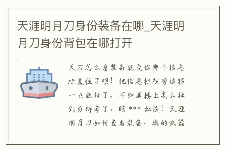就是你那個信息欄蓋住了唄!把信息欄往旁邊移一點就好了。不知道樓上怎么扯到分辨率了,瞎 *** 扯淡!天涯明月刀如何查看裝備,我的武器在哪里?打開人物,然后把界面移開。你就會知道。原來裝備被界面擋住了。