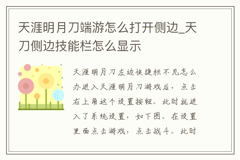 問題一:天涯明月刀左邊快捷欄不見怎么辦? 先切換回全屏,然后在“設置”里點開“系統設置”里面的“游戲”欄,然后在點開“戰斗”,把里面的“顯示側邊快捷欄5”,有勾的去掉重新打勾,想多要的快捷。