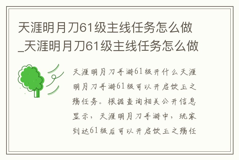 天涯明月刀61級主線任務怎么做_天涯明月刀61級主線任務怎么做視頻