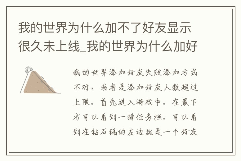 我的世界添加好友失敗添加方式不對,或者是添加好友人數超過上限。首先進入游戲中。在最下方可以看到一排任務欄。可以看到在鉆石鎬的左邊就是一個好友標志,點擊好友標志。然后點擊右上角的添加。點擊添加之后,就可以在這里輸入你的朋。1、為什么沒有辦法加好友顯示對方長時間未登錄從你的描述來看,你沒有辦法加