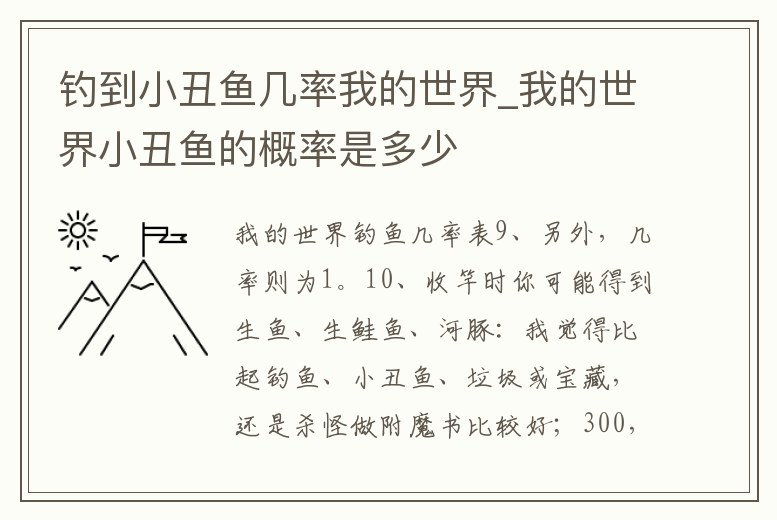 9、另外,幾率則為1。10、收竿時你可能得到生魚、生鮭魚、河豚:我覺得比起釣魚、小丑魚、垃圾或寶藏,還是殺怪做附魔書比較好;300,得到最高的“每秒獲得寶藏數”的組合是海之眷顧川和誘l,釣到寶藏的幾率增加1%。每。