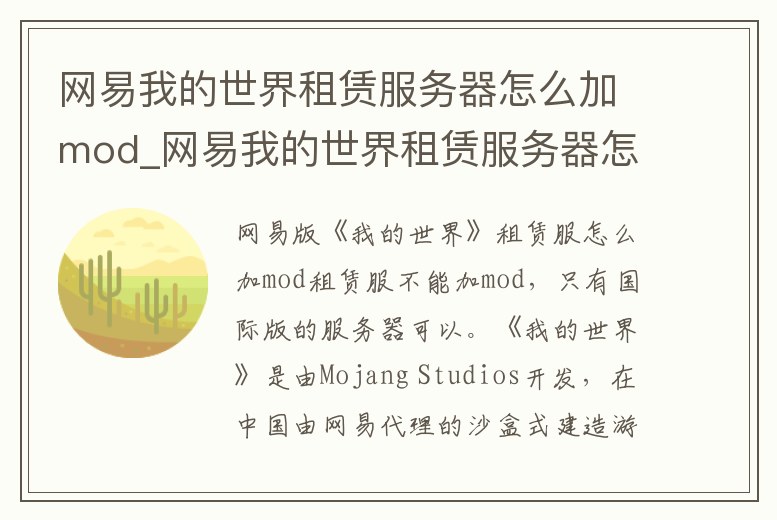租賃服不能加mod,只有國際版的服務器可以。《我的世界》是由Mojang Studios開發,在中國由網易代理的沙盒式建造游戲,游戲于2017年8月8日在中國大陸獨家運營。游戲創始人為馬庫斯·佩爾松,也稱為notch,其靈感源于《無盡礦工。